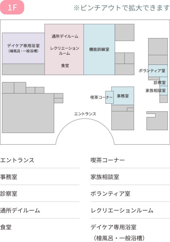 1階は主にデイケアとリハビリテーションに使用されます。機能訓練室には、充実したリハビリ設備13台が用意されています。特にトレーニング機器を4台設置し、高度なリハビリが可能です。デイルームは、広々とした空間で外のテラスに出てリフレッシュも可能です。テラスは車の音も無く静かで、時折野鳥の鳴き声に心癒されます。 浴室に入ると、浴室全体に広がる檜の香りに心が和みます。檜風呂に入りながら美しい坪庭を眺めることもでき、心安らぐひとときを感じていただくことができます。